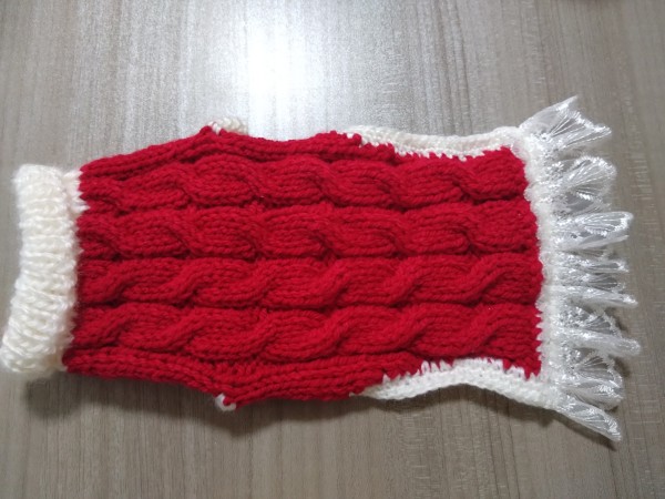 クリスマスを意識して、色を白と赤にしました。 頭からかぶれるようにゆったりめの首もとにして、ミシンゴム糸を通しました。 背中側は縄編です