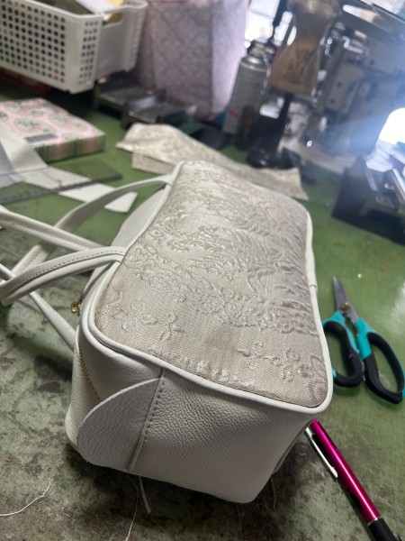 ![]() 張り込み工程で 外縫いの鞄 オーソドックスタイプの鞄 一宮の個性的なファブリックを使います  BERA BERA