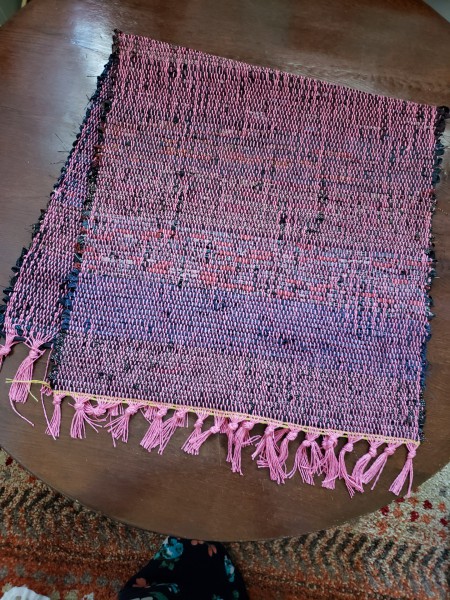 裂織でトートバッグの予定。 横糸は紬の端切れを1センチに裂いて。 ピンクの縦糸の色が強くて凹む