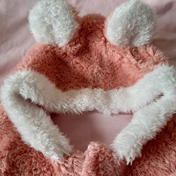 赤ちゃんのカバーオール 熊さんおくるみ 白のファーを娘が染色 可愛い色になったので思わず撮影 型紙も自分たちでおこして作成しています!