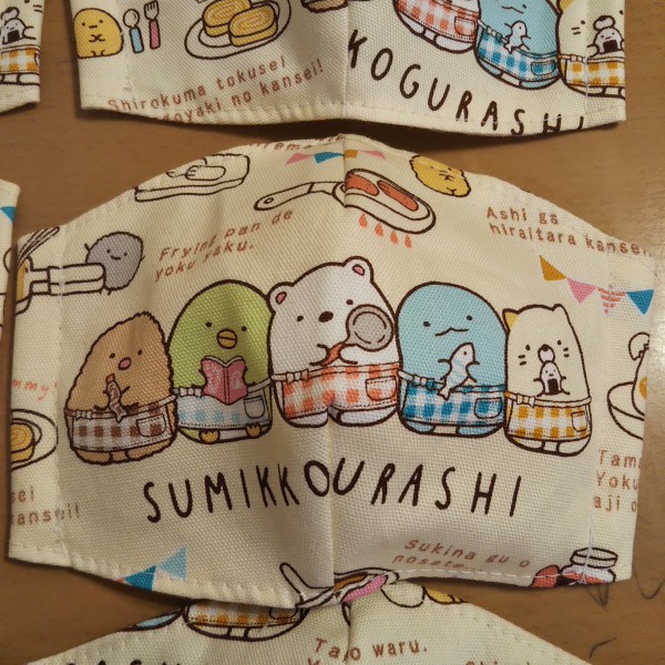 すみっコぐらしが好きな娘の為にすみっコぐらしの生地を30センチ程購入。 柄をみながらカットします。 スカートはまたお預け(;つД`)