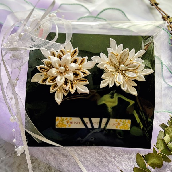 バンスクリップ。押し花とレジンで、両面柄が違うのが特徴です。 レジンを塗っているところは、 穴があいてる既成の金具 難しい点は、 水平に保ち液が漏れないように さらに、金具に液がつかないようにするところです。 浴衣にも合うようにしてみました。