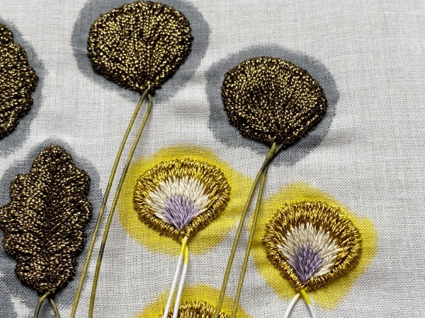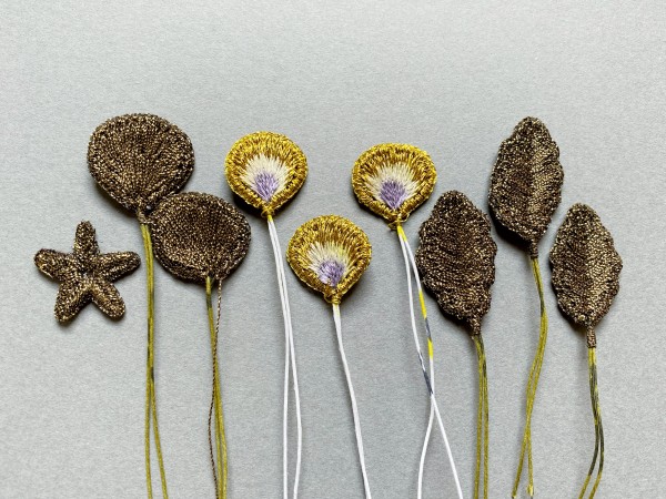 根っこつきパンジーのブローチを制作中。 花びら、葉っぱ、ガクの刺繍が刺し終わったところ。 この後、裏側をほつれ止め加工して刺繍パーツに切り出していきます。