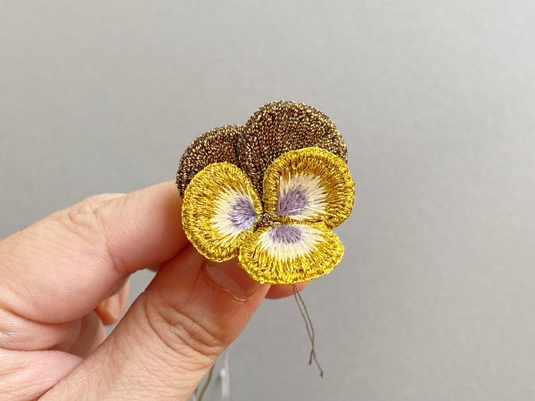 根っこつきパンジーのブローチを制作中。 花の刺繍パーツを組み立てたところ。 可愛くできてる。