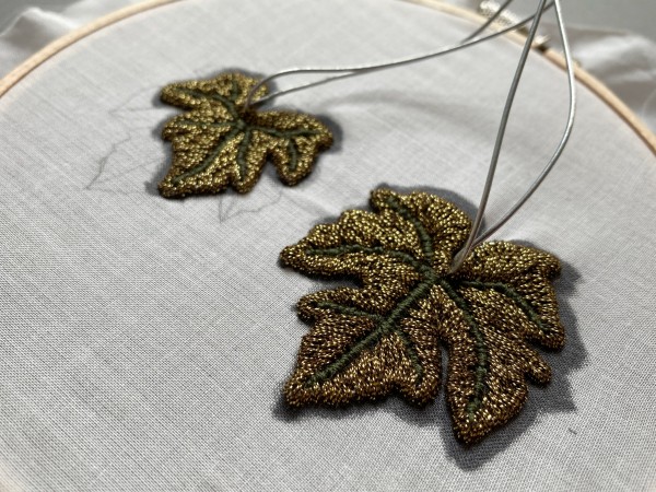 立体刺繍で葡萄のブローチを作っています。 写真は葡萄の葉っぱの刺繍。 2枚同じ大きさの葉っぱにしようと思って下絵を書いたけど、やっぱり葉っぱを1枚小さくしたくて下絵を書き直して小さく刺繍しました。 小さい葉っぱの下絵がズレてるのはそんな理由です。