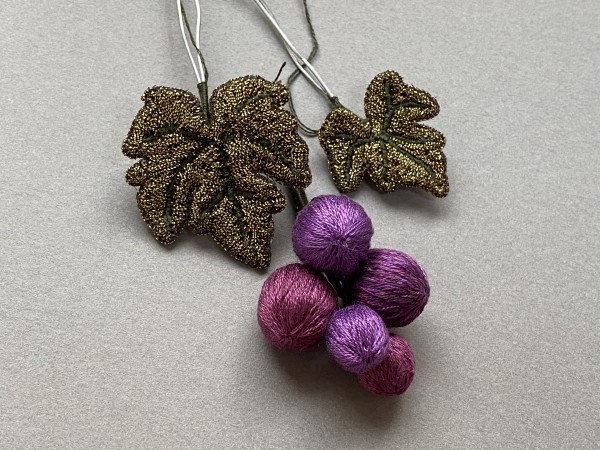 立体刺繍で葡萄のブローチを作っています。 写真は葡萄の葉っぱと実の刺繍パーツ。 葉っぱは布から刺繍を切り取って、ふちをブランケットステッチでかがっています。