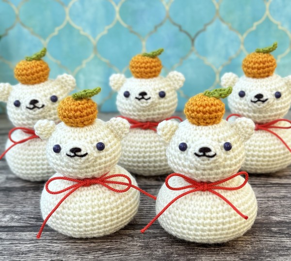 あみぐるみの顔。 紫色の目にしました。上の餅と、下の餅の大きさのバランスを考えました。