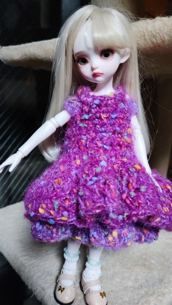 ドール用のワンピース。 身長約30cmのドールに編みました。 ふわふわでボリュームたっぷりです。