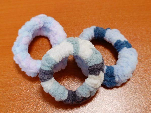 使用編針の目安よりも小さいかぎ針しかなかったので、持ってるかぎ針で太めのを使いました 丸い髪ゴムを使ったのですが、平ゴムを使ったみたいな形になりました