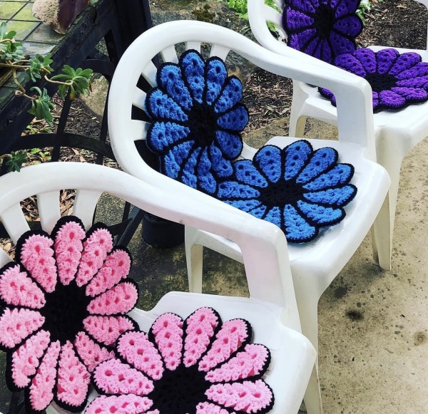 ガーデンチェアが少し薄汚れてきたので目隠しに編んでみました 2枚重ねでトリミングしているので若干クッション性もあり客人にも好評です