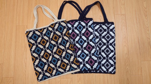 バッグの底のマチ部分がうまくできたと思う ここ数年、何度も思索して編んでは納得できずを繰り返してきた 繋ぎ目部分も目立たないようにしたくて何個も編んで悩んだけど、最終的に表から分からないように編めるようになった