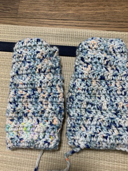 ハンドウォーマー2種類作りました。白い方はNHKのすてきにハンドメイドで放送していたつぶつぶハンドウォーマーの編み方です。カラフルな方は8号と6号のかぎ針編みで、細編みと長編みを交互に。去年の毛糸の余りなので小さいものをと思い編んで見ました。