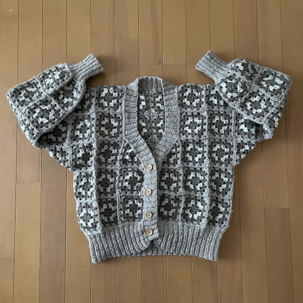 モチーフを繋げたカーディガンを編みました。長い道のりでした…。 地道にモチーフを編み、繋ぎながら大きなパーツを作り、さらにそれを繋げてから、棒針で裾・襟・袖口を編みました。 棒針は裾と襟に4号輪針60㎝、袖口は4号4本針を使用しました。二目ゴム編みです。