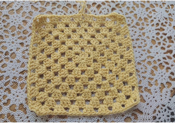 グラニースクエアのブランケット作成中。 happyknittingmamaさんの動画を参考にしています。