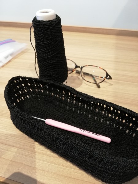 MONDO FILさんのコードヤーンを使ったバッグ。リボンを通すのが大変だったー(笑)
