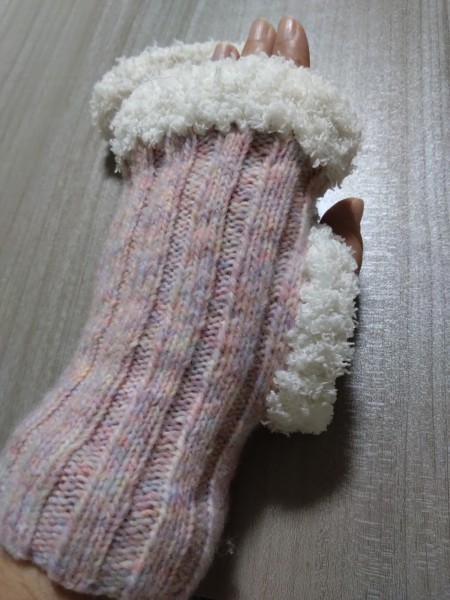 ハンドウォーマー 収縮性が欲しかったので、 表3裏2の繰り返し編み 親指と上の指出し口を モコモコの糸でかぎ針の長編みで仕上げました。 3日と言いましたが実数9時間で編めました