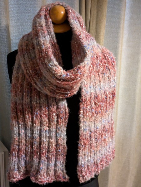 砂糖菓子のような、ネップが散りばめられた毛糸をみたら、マフラーが編みたくなりました ストレッチループを引き揃えると、モチモチとした感触のマフラーになりました