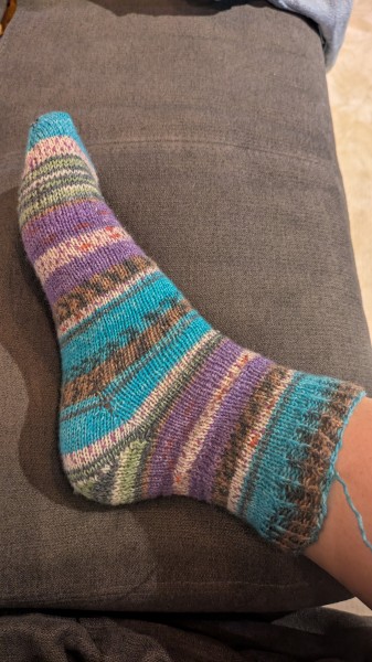 つま先、踵、履き口は単色で、その他の部分は段染めで編んだ手編み靴下
