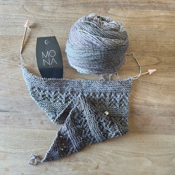 ラベリーのフリーパターンFae Wing Shawl(by Kelly McClureさん)をMONA1玉の編み切りで。