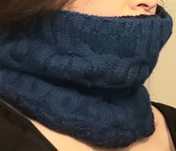 【 リバーシブルに使えるツートンColorのカウル】 とても手触りの良い「原毛に近いメリノウール」という毛糸に出会い、チクチクしなさそうなので首もとに。 濃紺とピーコックブルーで、作業着の青にも合うカウルを。