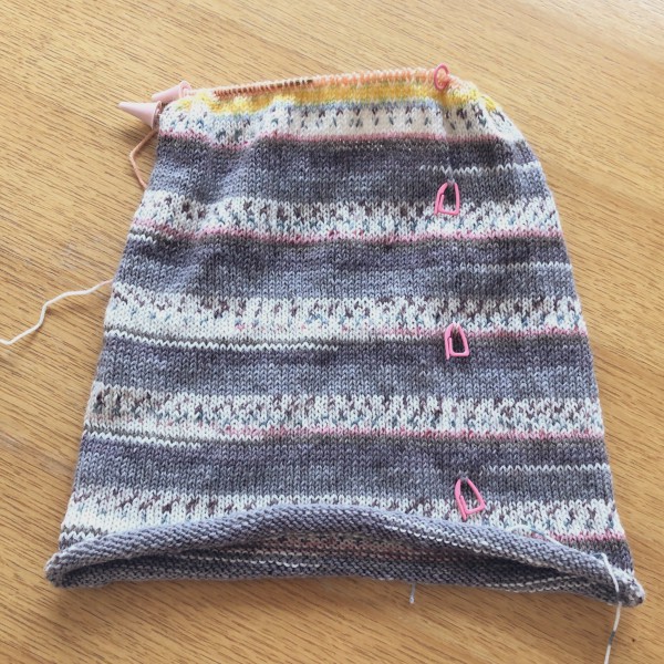 春や秋のちょっと寒い時に使うスヌードがほしくて、細めの糸で軽い編み地になるように編んでいます。在庫糸消費のため、元のデザインより小さくしています。