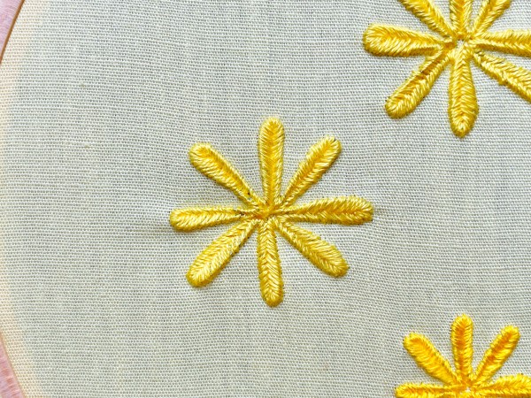 根っこつきのたんぽぽを立体刺繍で作っています。 写真はたんぽぽの花びらを刺繍したものです。