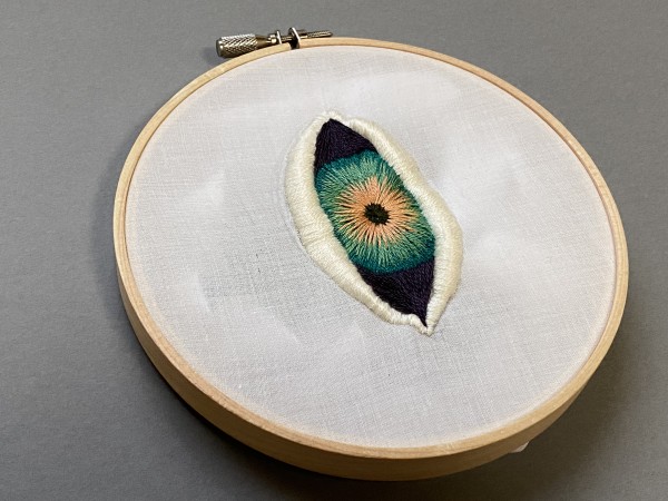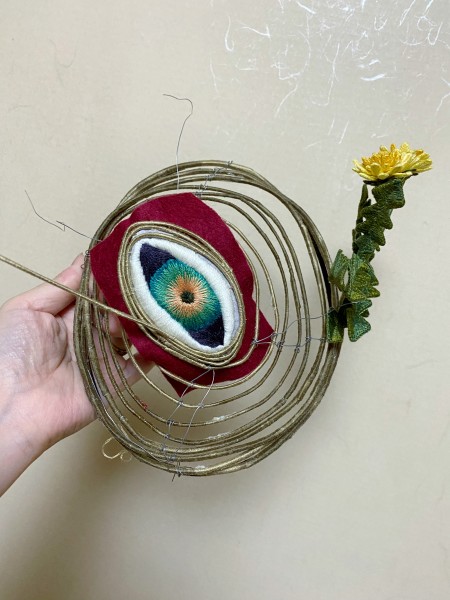 幡ヶ谷仮面展に出展するたんぽぽの仮面を制作中。 急遽、追加することにした目の刺繍パーツ。 だんだん、おどろおどろしくなってきてるかも。