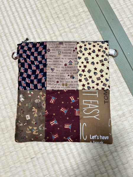 マチが広めの化粧ポーチ。表地はパッチワーク、中ポケットもつけました。 何個も作るとだんだんコツが分かってきます。