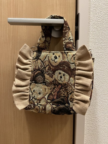 ベアのゴブラン調生地でフリルミニバッグをつくりました。 背面はポケットにしました。たまたま柄合わせができてよかったです。外ポケットはスマホやパスケースが入るサイズです。ショルダーにもできるようにサイドにDカンをつけました。