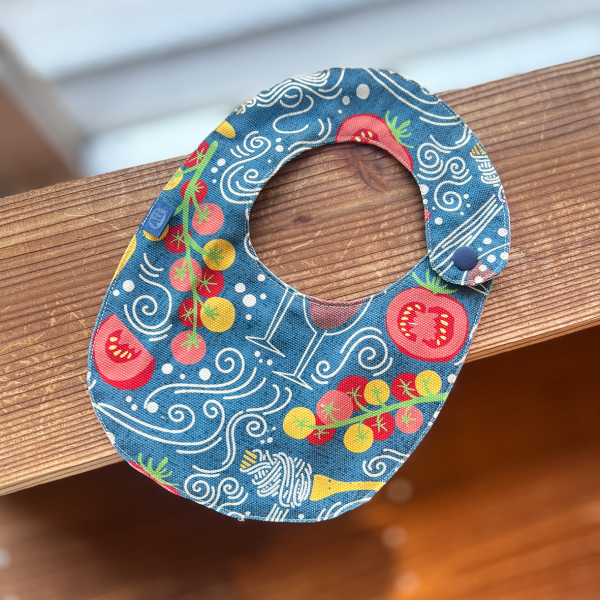 エプロンを作った余り布でベビースタイを作りました。 裏面は明るい色の生地をパッチワークで組み合わせています。