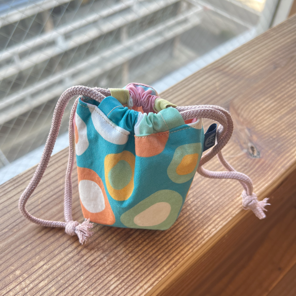 レトロでシンプルな丸をデザインした生地で作った巾着。 裏地の生地も同じデザインです。 デザイン: Happy Vibe Circles コレクション: Retro Luck Infusion
