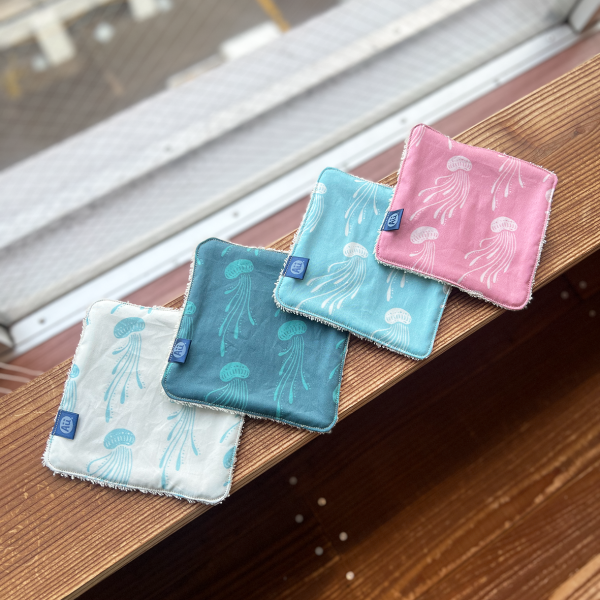 裏面にオーガニックコットンを縫い合わせたミニタオル。 クラゲがゆらゆら泳いでいるデザインです。この夏は大活躍しました。 デザイン: Graceful Drift コレクション: Celestial Treasures
