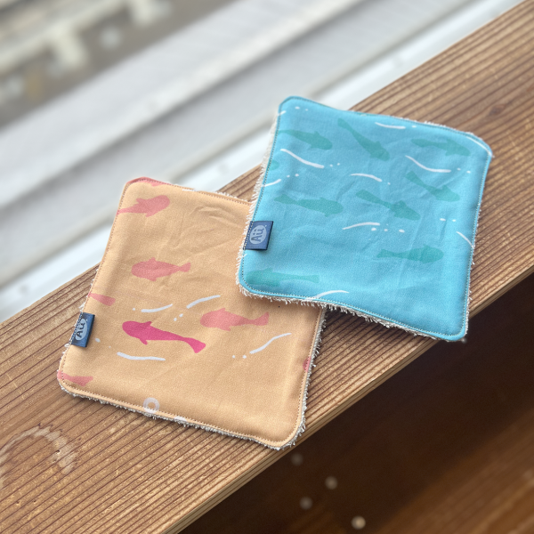 裏面にオーガニックコットンを縫い合わせたミニタオル。 小さな魚たちが群れになって泳ぐ、シンプルなデザインです。この夏は大活躍しました。 デザイン: Aquatic Symphony コレクション: Celestial Treasures