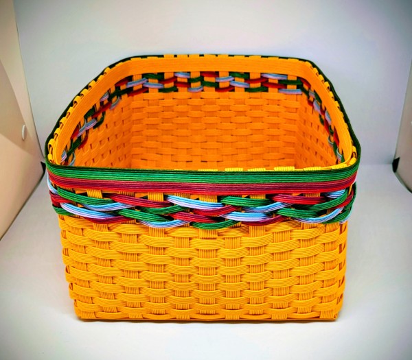 クラフトバンドで作った ビタミンオレンジのかごが売れたので、海外製のターメリックでかごを作りました。 出来上がりが ひと回り大きくなっています。