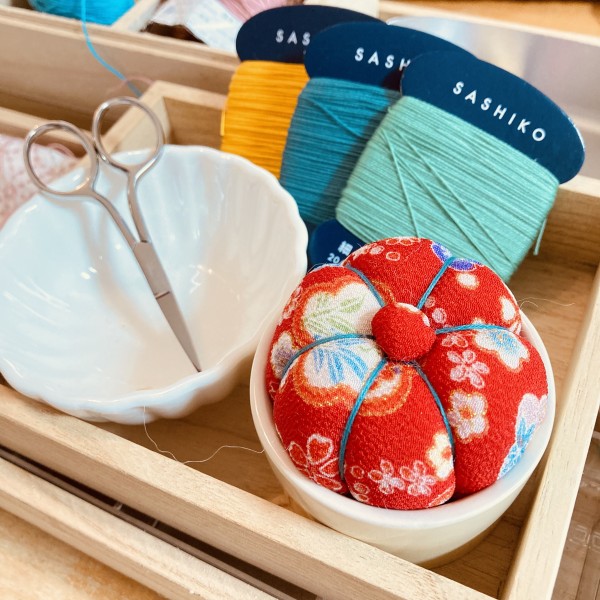 ティーカップ型ピンクッションを作りました。アクセントに蝶々を留まらせました♪