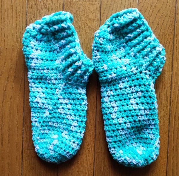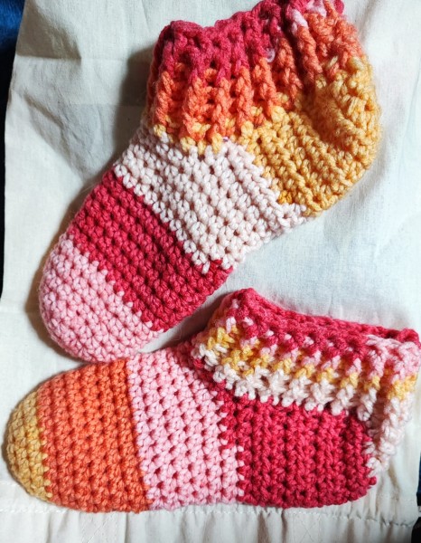 ルームソックス。 レディース用。 身内へプレゼント。 段染めの糸なので、どんな仕上がりになるか楽しみでした。4足目ですが、飽きずに編めてます。