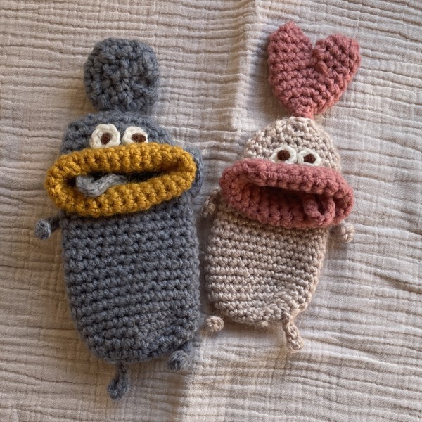 パクパクモンスター ネットで見かけて可愛さにつられて編んでみました。 糸の太さで大きさがずいぶん変わるのね。 青は並太、ベージュは中細です。 くちびるは並太なのでタラコくちびるになっちゃった