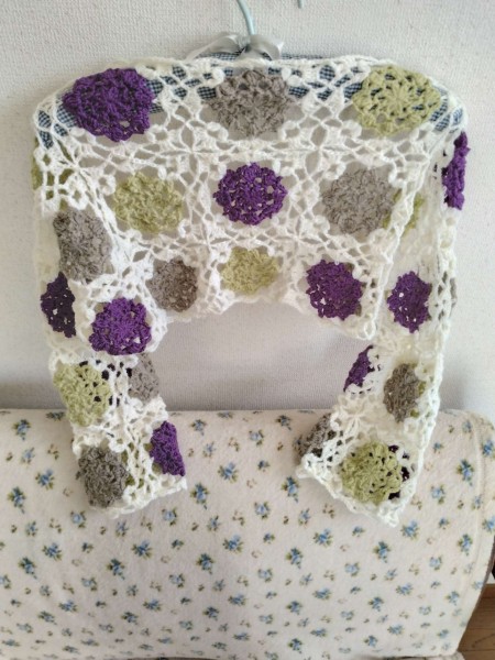 3色の丸いモチーフを33枚作り、周りを白い糸で連続して編みつなぎました。 中途半端に残った糸を利用できてスッキリしました。 マーガレット スカーフとして 使用できそうです。