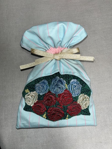 PCで機械刺繍のデータを作り、ブーケに見える巾着を作りました。 背面はポケットティッシュが1パック入ります。バッグに付けられるようにしました。