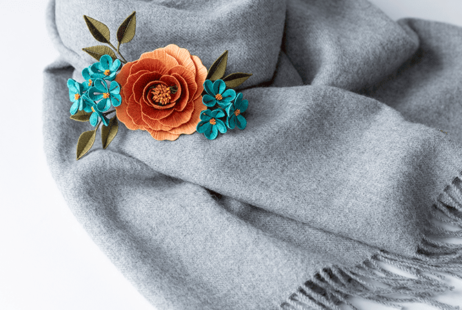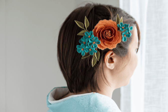 オフフープ(R)立体刺繍作家PieniSieniさんのデザインです。作品づくりの楽しみをお聞きしました。「型紙を縮小して数を調整すればブローチなどにも応用できますし、金具をバレッタやポニーフックにしても楽しいです」「糸まき花は手芸に興味を持っていてもなかなか取り組めなかった方の第一歩に最適な技法。つまみ細工との相性も良く、布花など他ジャンルのクラフトと一緒に楽しんでいただけると思います」