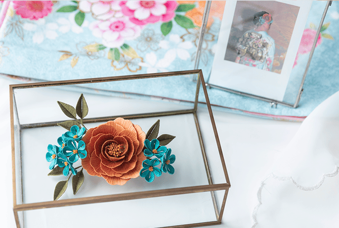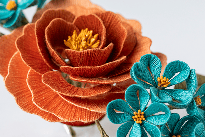 大切な日の、晴れやかな表情をさらに明るく彩る「髪飾り」。着物や帯の色に合わせた誰も持っていない自分だけの髪飾りを作りませんか?糸まき花は紙と刺繍糸で制作しているので、大ぶりで華やかなのに軽量で着け心地が良いのが特徴です。種類も色数も豊富な刺繍糸から、お気に入りの糸を選んでお着物に合わせた髪飾りをつくるのも素敵ですね。パーツの組み合わせをアレンジして、さらに自分らしい作品も作れますよ。