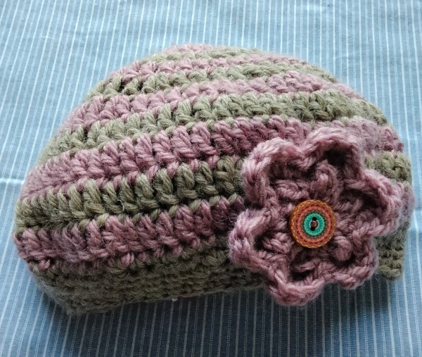 残り糸消費、、YouTube「いつの間にか62歳」さんのうずまきベレー。お花のコサージュも付けてみました
