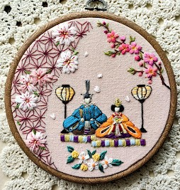 おひな様の刺繍には時間がかかりました。 ピンクの布地で春らしい雰囲気になりました。