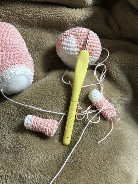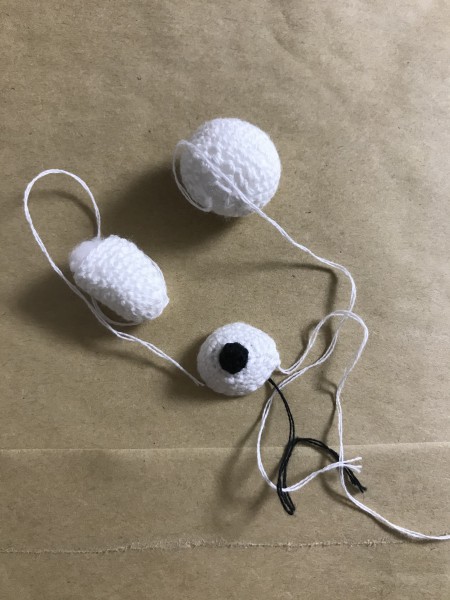 本を見ながらの作成しました。 顔と胴体が難しく、縫い合わせでは首を傾げるようになってしまいました。