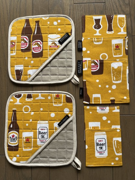 柄物の布は一枚の手ぬぐいです。約20センチ四方の鍋つかみ2枚と13センチ四方3枚、10センチ四方2枚のコースターができました。 楽しい柄の手ぬぐいをたくさん見つけたので、調子に乗っていっぱい作りました。