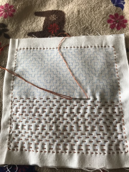 セリアの刺し子です。柿の花。渋い茶色の刺繍糸で刺してます。この模様、可愛くて好き。黙々とできるのも良いです。