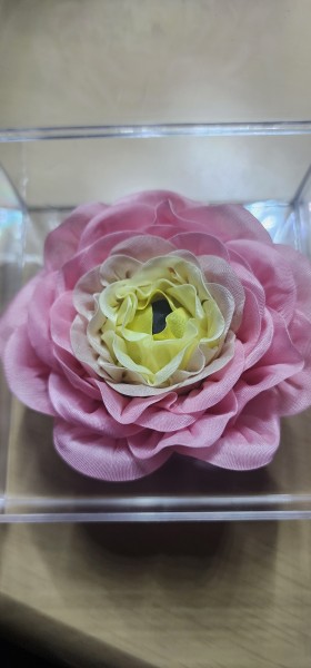 PCで機械刺繍のデータを作り、ブーケに見える巾着を作りました。 背面はポケットティッシュが1パック入ります。バッグに付けられるようにしました。