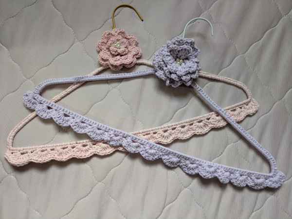 新しい職場は個別のロッカー無し 各自ハンガーを用意して、 廊下のコート掛けに掛けておくそう 目印にハンガーに装飾しました ニッタオルの時に、たくさん用意したコットン糸の残りを使いました