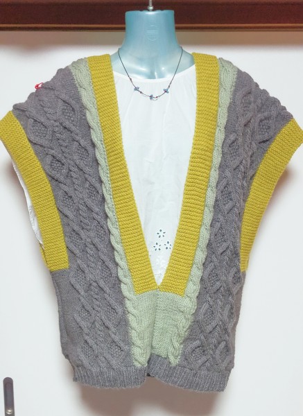 輪針でアラン模様のベスト