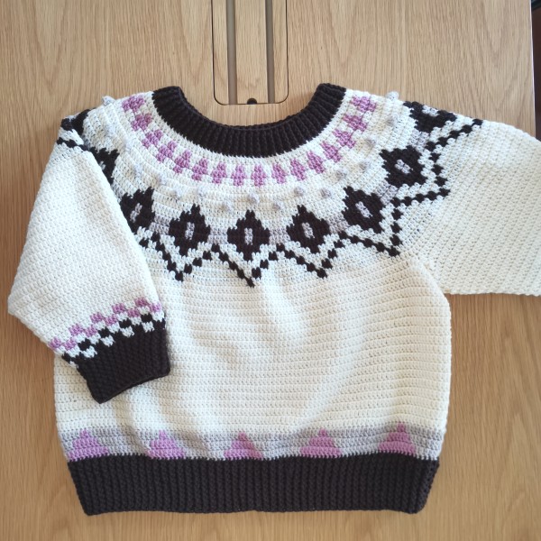 ニットデモッテかぎ針編み作品としては珍しい、ノルディック柄の丸ヨークセーター 「かぎ針編みの丸ヨークセーター」(applemints、日本ヴォーグ社)掲載作品より一部アレンジして編みました。 長編みなので一週間程で楽しく編めました。